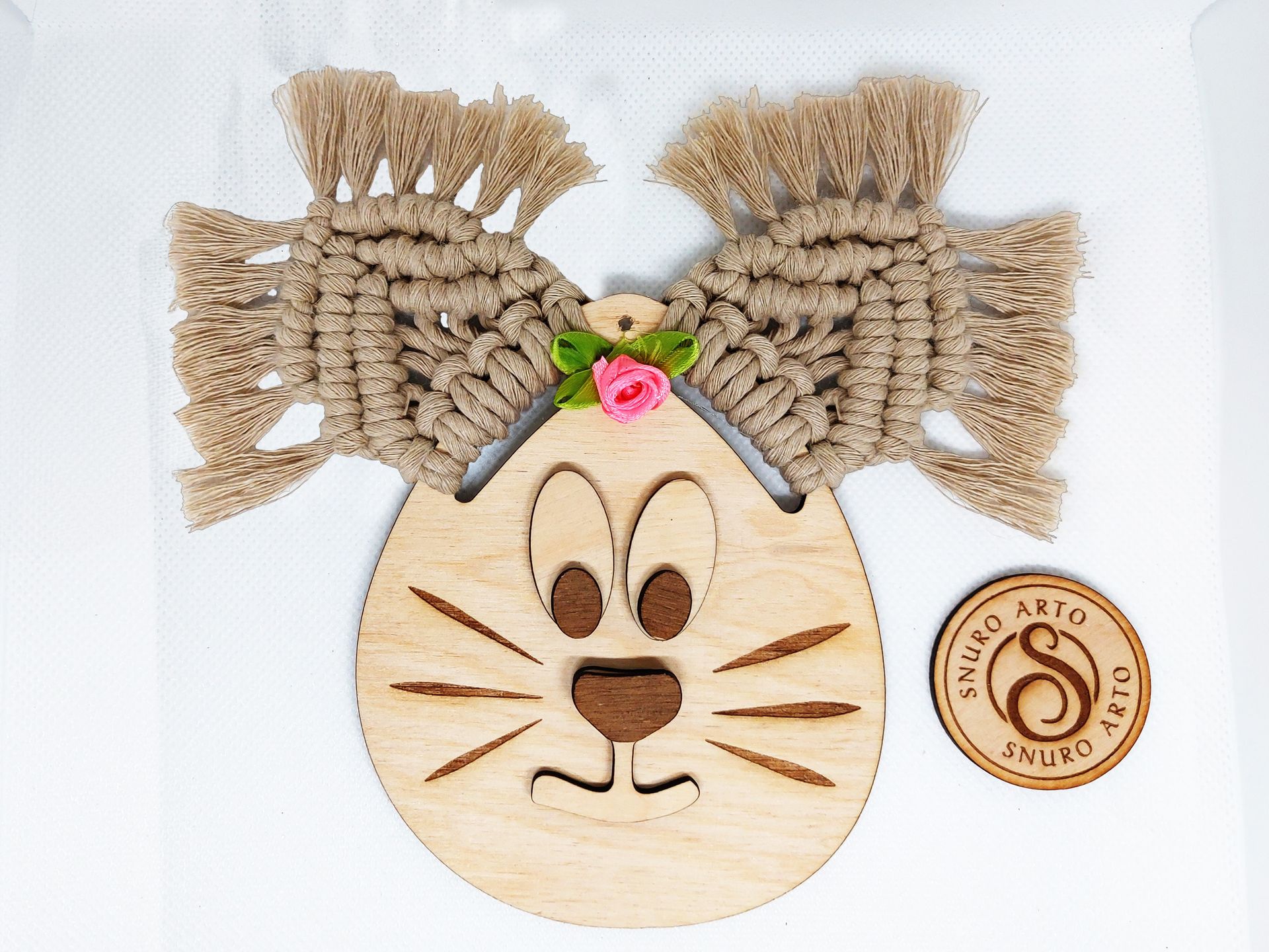 Naše kraslice je oživena makramé ušima, které dodávají produktu hravý a originální vzhled. S průměrem příze 3 mm a rozměry 17x19 cm se stane nepřehlédnutelným kouskem vaší výzdoby. Díky závěsnému uchycení ji snadno umístíte kamkoliv ve vašem domově.